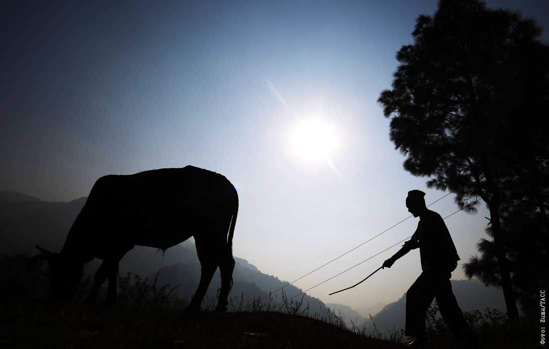 Мужчина пасет скот в деревне на окраине Катманду, Непал