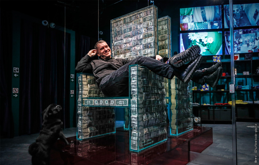 Стеклянный трон, наполненный миллионом долларов, представили в Art Residence в Москве. Необычный арт-объект создал российский художник Алексеей Сергиенко.