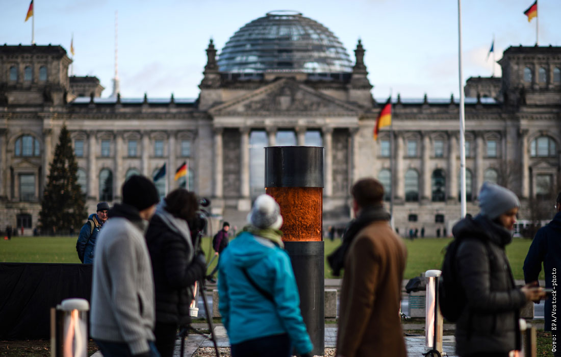 Художники из "Центра политической красоты" установили перед берлинским Рейхстагом монумент "колонна сопротивления", который состоит из пепла и остатков костей людей, погибших в концлагерях