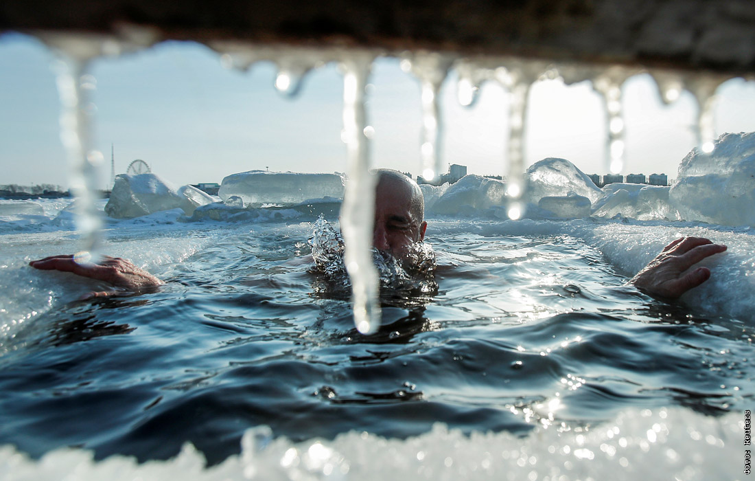 Купание в проруби на приграничной реке Амур, разделяющей российский Благовещенск и китайский Хэйхэ