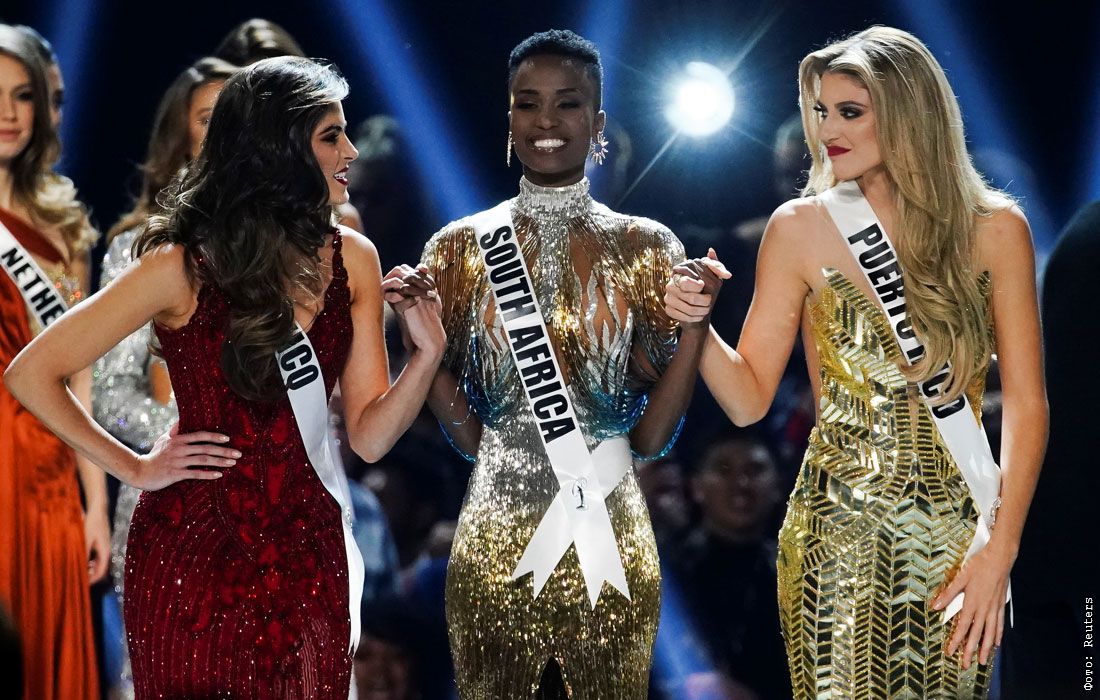 В Атланте прошел финал конкурса "Мисс Вселенная-2019". Первое место заняла участница из Южно-Африканской Республики. В тройку финалистов конкурса также вошли представительница Пуэрто-Рико Мэдисон Андерсон и мексиканка София Арагон. Россия не была представлена на конкурсе, так как у победительницы Мисс Россия-2019 Алины Санько не было времени подготовиться к конкурсу и получить визу.