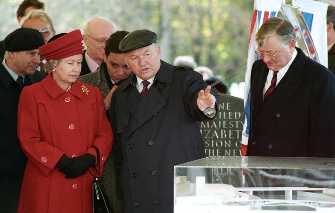 Мэр Москвы представляет королеве Великобритании Елизавете II макет нового здания британского посольства. 1994 год.