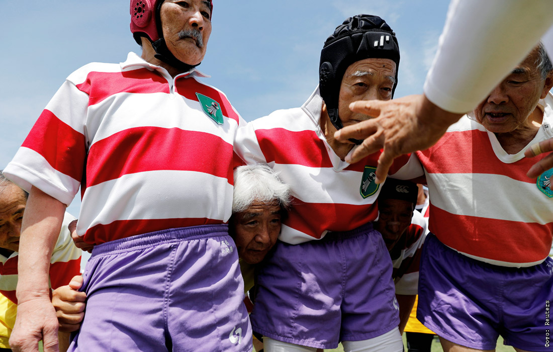 Пожилые игроки в регби тренируются перед матчем в Кумагая, Япония. 2 сентября.