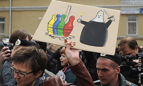 Во время несанкционированной акции "Судебный фестиваль" возле здания Таганского суда, где решался вопрос о продлении ареста участницам феминистской панк-группы "Pussy Riot".