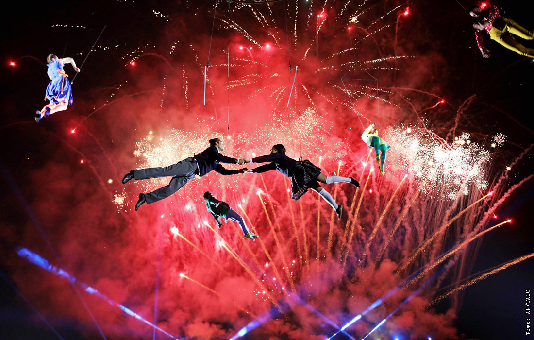 Артисты выступают во время пиротехнического шоу площади Боливара в Боготе, Колумбия