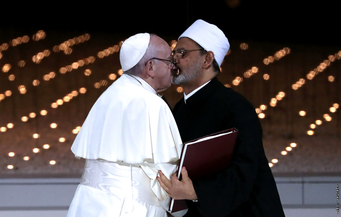 Папа римский Франциск и верховный имам Аль-Азхара зацепились друг за друга очками во время подписания документа о борьбе с экстремизмом в Абу-Даби, ОАЭ