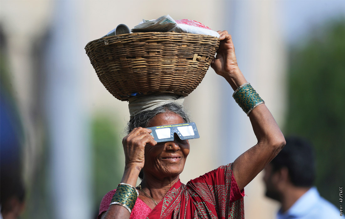 Жительница индийского города Хайдарабад в специальных очках для наблюдения затмений