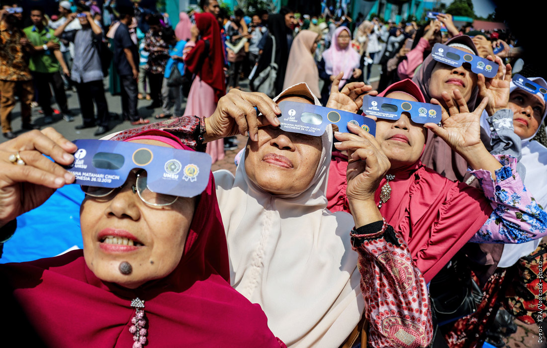 Утром 26 декабря жители многих стран могли видеть кольцеобразное солнечное затмение, при котором Луна закрывает диск Солнца не полностью, а так, что по краям видна яркая солнечная "кайма", окружающая темный лунный диск. Максимальную фазу затмения, которая продлилась 3 минуты 40 секунд, могли наблюдать в Сингапуре, Саудовской Аравии, южной Индии и части Индонезии.