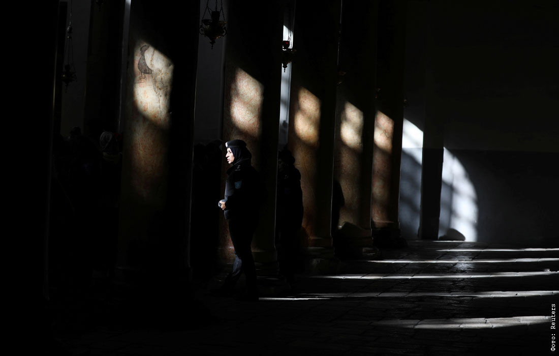 Сотрудница полиции в храме Рождества Христова в канун Рождества в Вифлееме, на Западном берегу реки Иордан