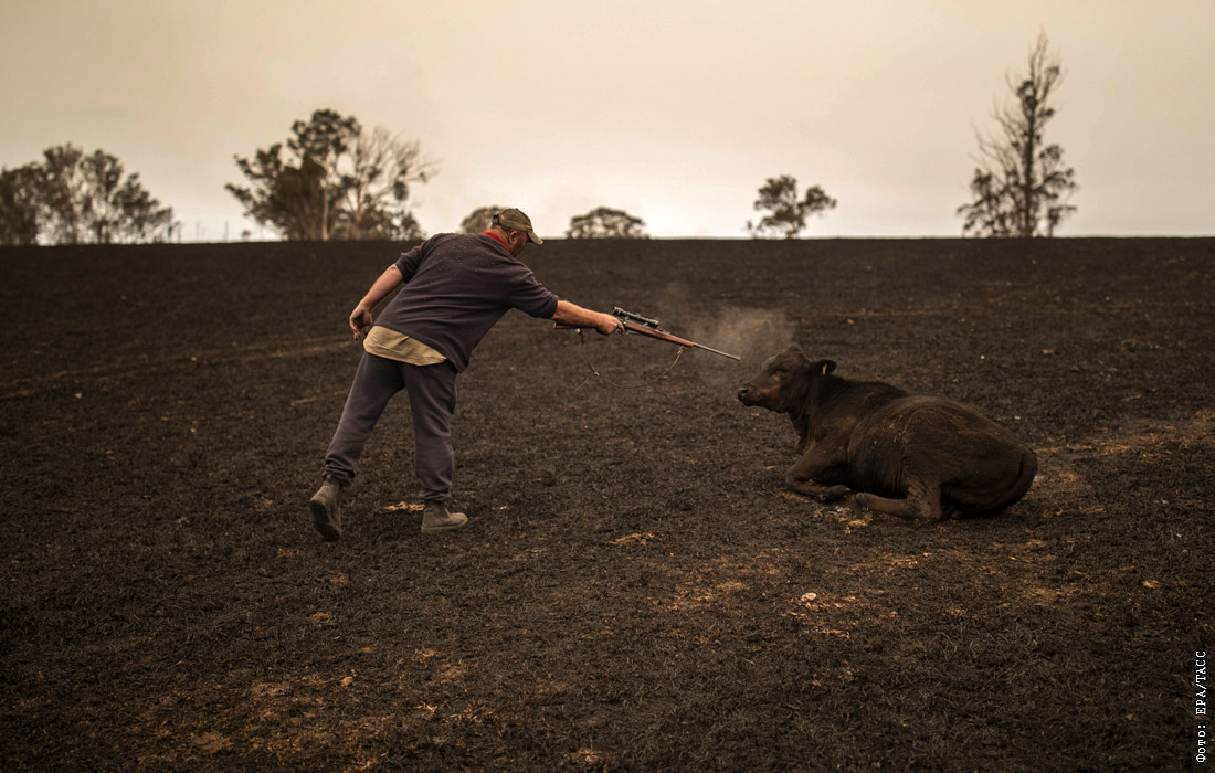 Владелец фермы усыпляет корову, которая была тяжело ранена в результате пожаров