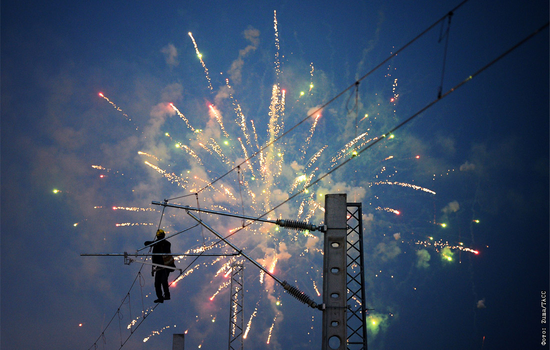 Электрик наблюдает за салютом в Сиане, провинция Шэньси, Китай