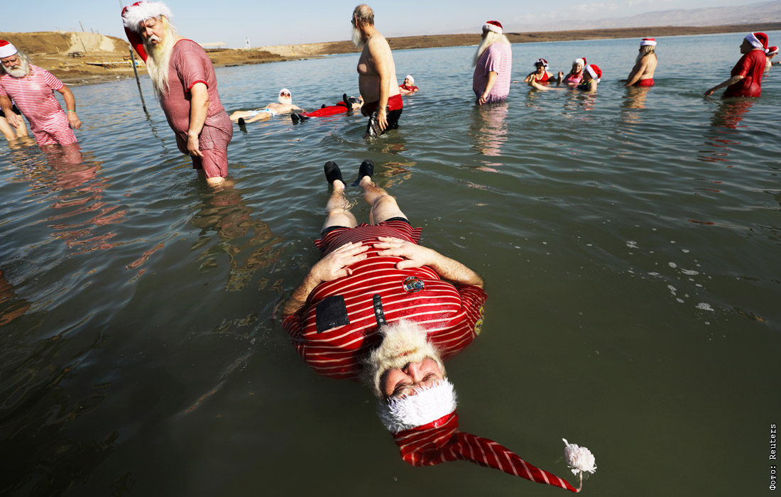 Санта-Клаусы купаются в Мертвом море в честь Рождества
