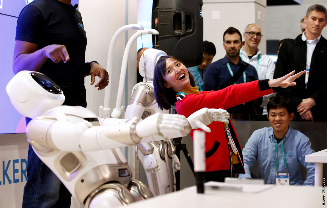 UB Tech представил умного робота-гуманоида на Международной выставке потребительской электроники CES 2020 в США. На фото: Журналистка китайского телеканала вместе с роботом воспроизводит позы йоги.