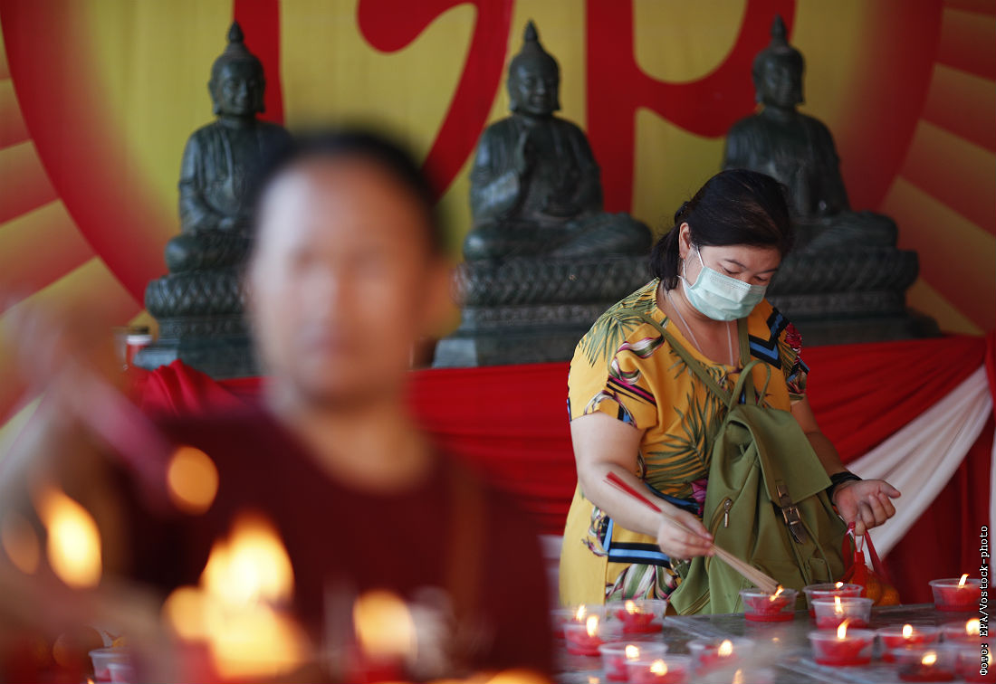 Женщина зажигает благовония в Храме Лотоса и Дракона в Бангкоке. Таиланд