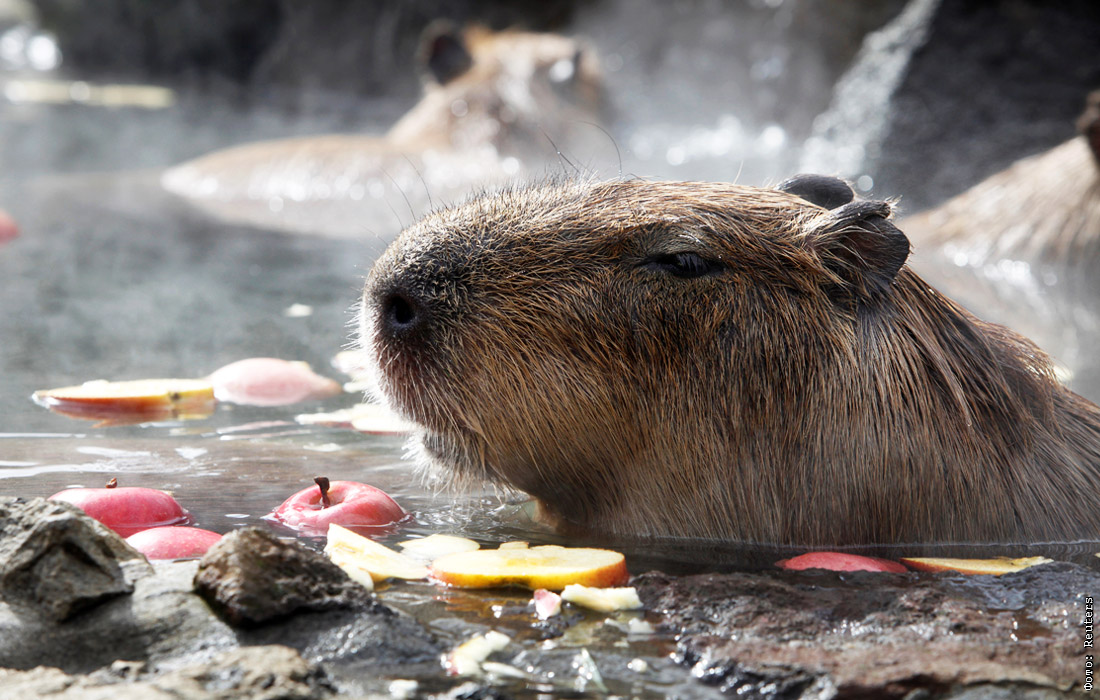 Капибары принимают горячую ванну с яблоками в зоопарке Изу-Шаботен в японском городе Ито