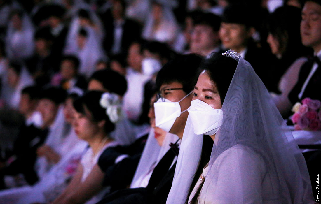 Несколько тысяч пар приняли участие в массовой церемонии бракосочетания в Южной Корее во время вспышки коронавируса нового типа из Китая