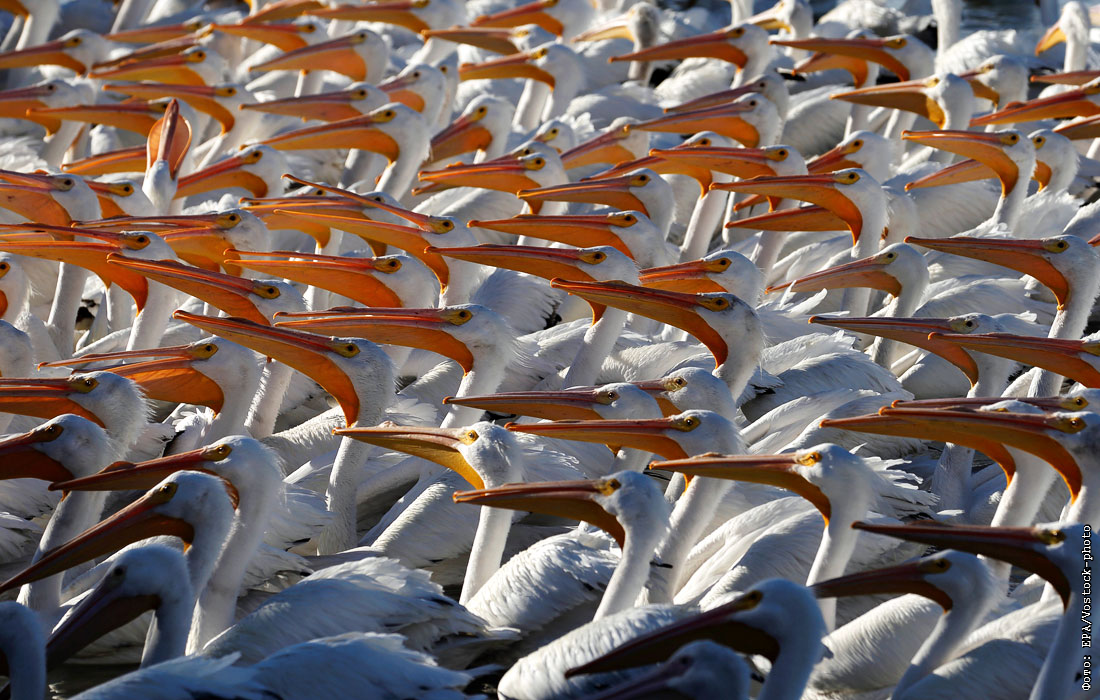 Американские белые пеликаны на берегу озера Чапала, Мексика