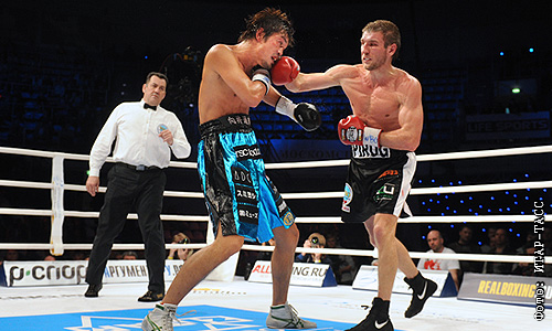 Нобухиро Ишида и россиянин Дмитрий Пирог (слева направо) во время боя за титул чемпиона мира по версии WBO во Дворце спорта "Динамо" в Крылатском.