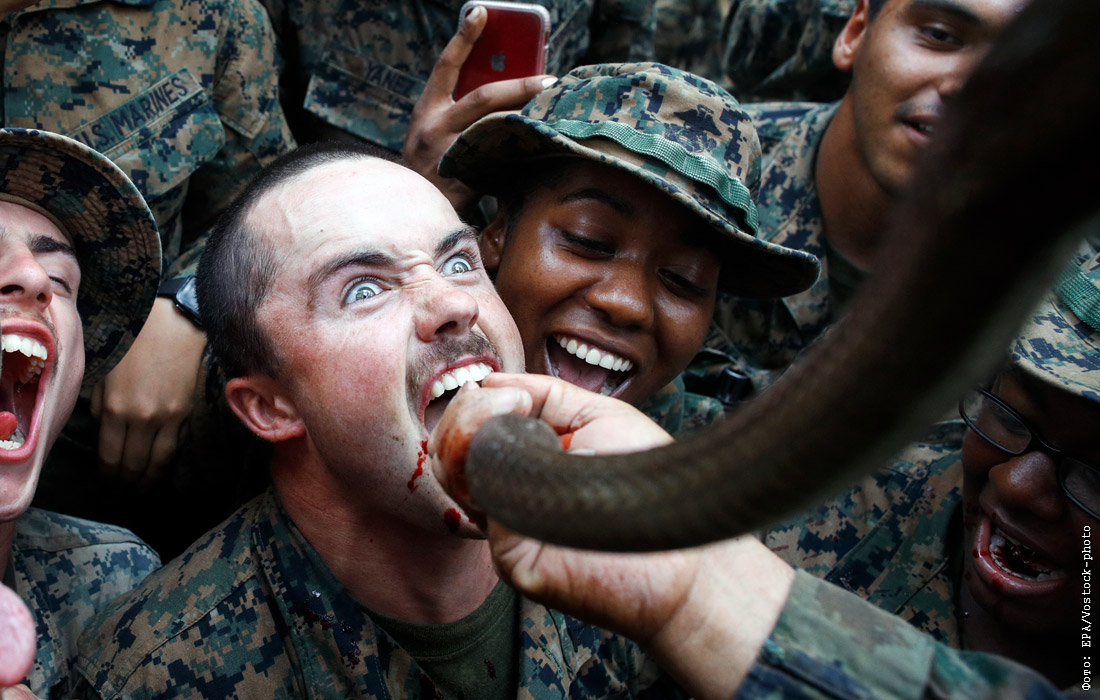 На тайской военно-морской базе в провинции Чонбури прошла тренировка по выживанию в джунглях, которая проводится в рамках ежегодных совместных учений США и стран Азии Cobra Gold. Одним из навыков в программе учебного курса является умение охотиться на змей и пить змеиную кровь.