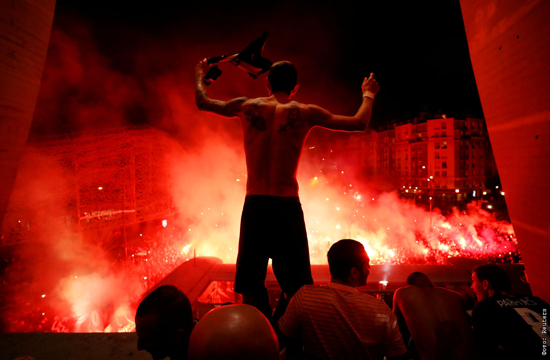 Футболисты ПСЖ отмечают победу со своими болельщиками. Париж, Франция.