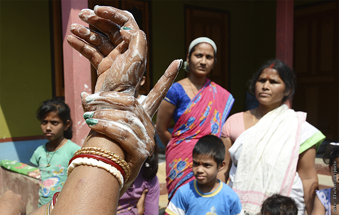 Индийские медработники провели обучение по гигиене рук для местного населения во время кампании по информированию о коронавирусе в деревне Уттар-Пара в Ассаме