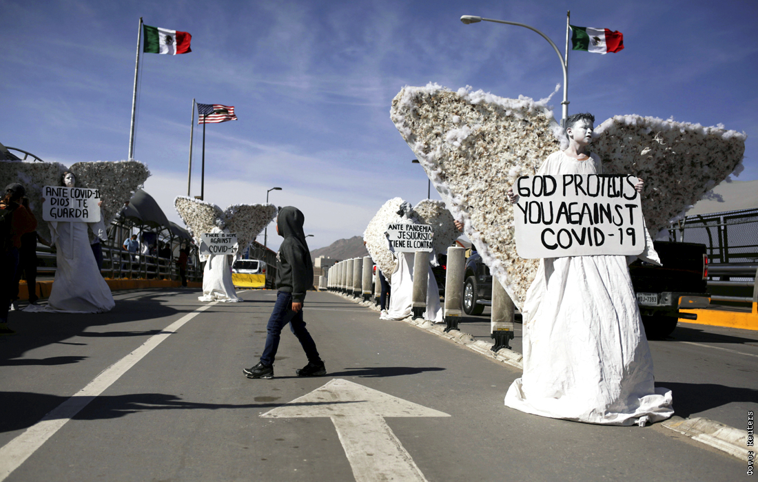 Члены евангелической церкви "Псалом 100" провели демонстрации в костюмах ангелов на международном пограничном мосту в Мексике