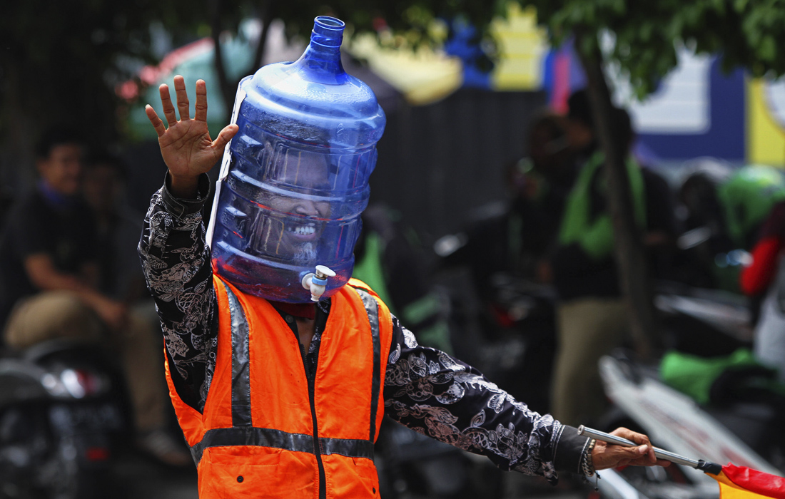 16 апреля. В Индонезии регулировщики движения вынуждены носить баллоны из-под воды из-за дефицита защитных масок и респираторов в стране.