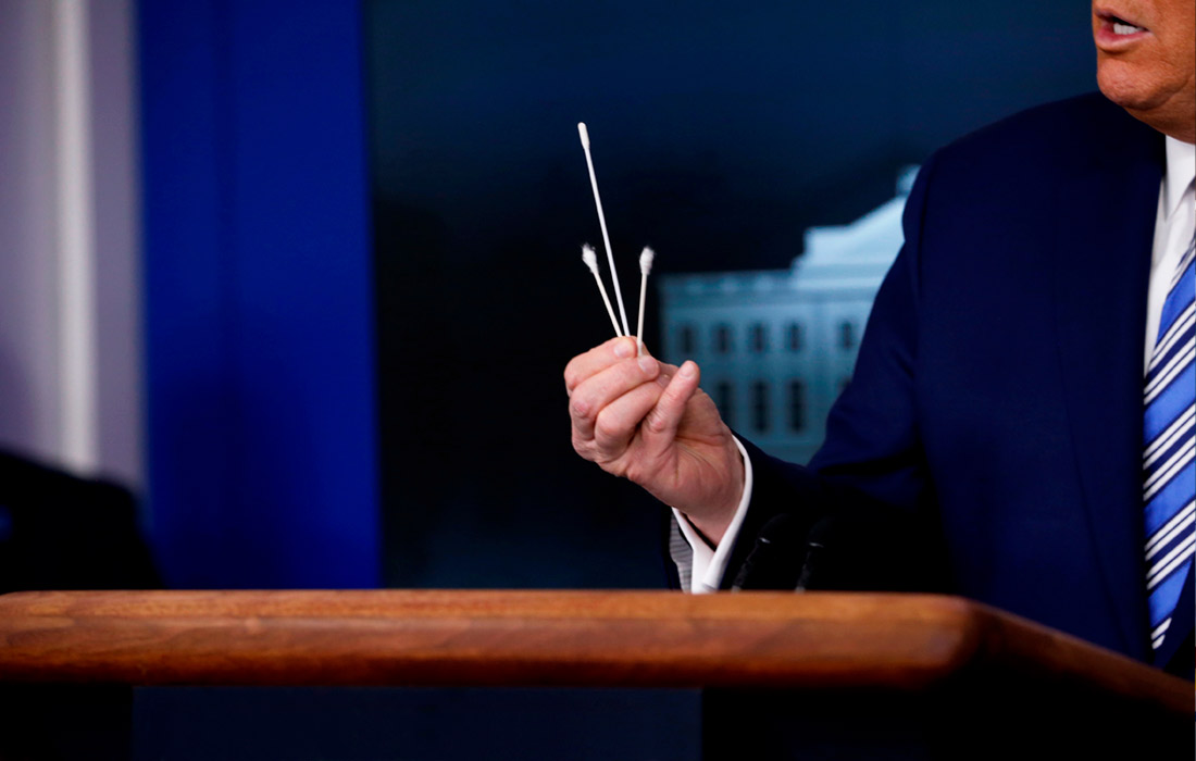 19 апреля. Президент США Дональд Трамп заявил, что 4,1 млн американцев сдали тест на коронавирус COVID-19. В стране на данный момент подтверждено 755 533 случаев заражения, скончались 40 461 человек. На фото: Дональд Трамп сравнивает палочки для тестирования на COVID-19 с обычными ватными палочками.