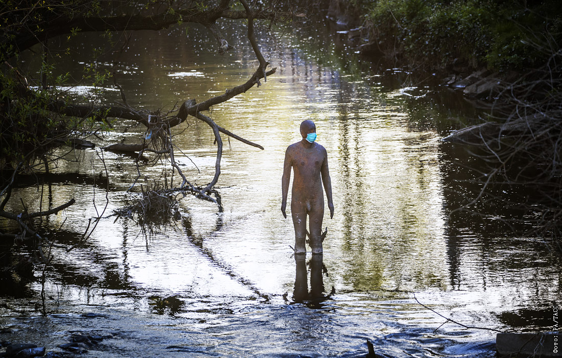 На чугунную статую художника Энтони Гормли надели медицинскую маску в Эдинбурге, Шотландия