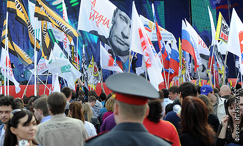 Участники митинга, посвященного годовщине создания Общероссийского народного фронта на Поклонной горе.