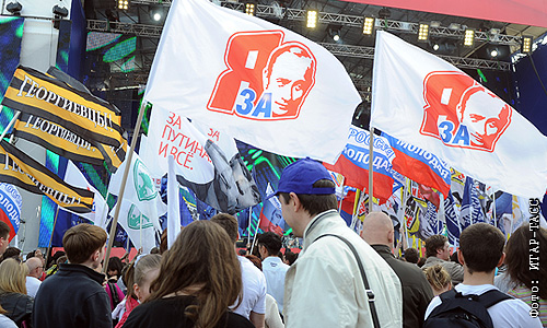 Участники митинга, посвященного годовщине создания Общероссийского народного фронта на Поклонной горе.
