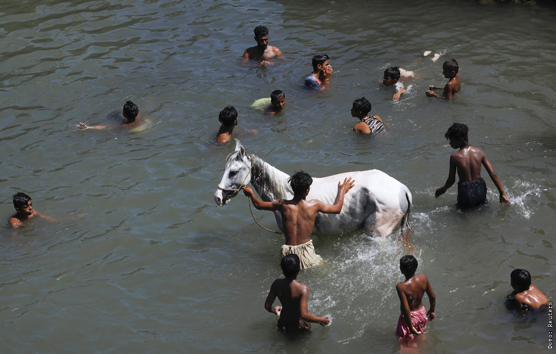 Купание лошади в Аравийском море во время Рамадана на окраине Карачи, Пакистан