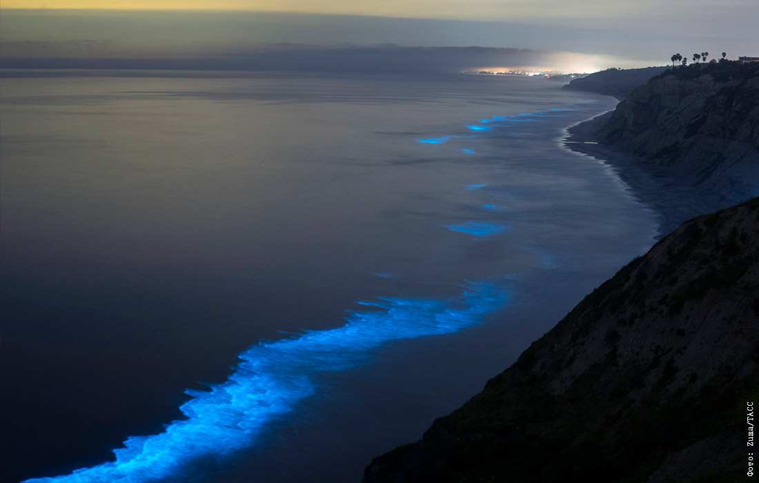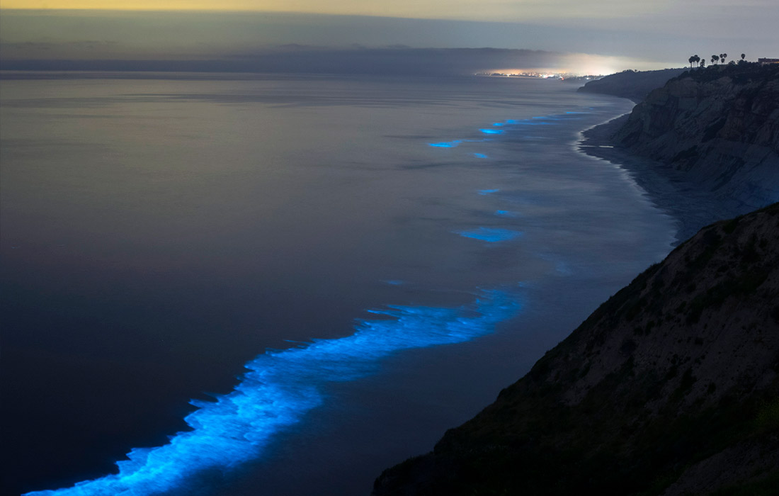 Цветение биолюминесцентных водорослей вдоль побережья Калифорнии осветило воды океана неоновым голубым свечением