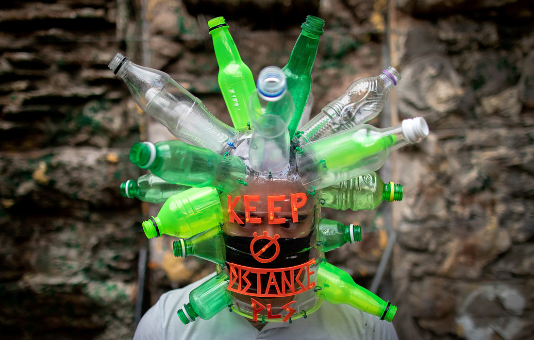 На Филиппинах число заразившихся коронавирусом превысило 15 тысяч. На фото: художник Лерой Нью в защитной маске из пластиковых бутылок в своей студии в Кесон-Сити.