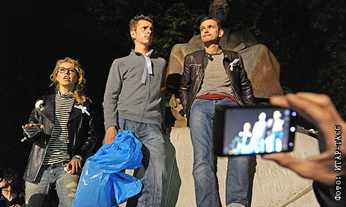Член федерального политсовета движения "Солидарность" Илья Яшин (справа) и телеведущая Ксения Собчак во время акции оппозиции на Чистопрудном бульваре.