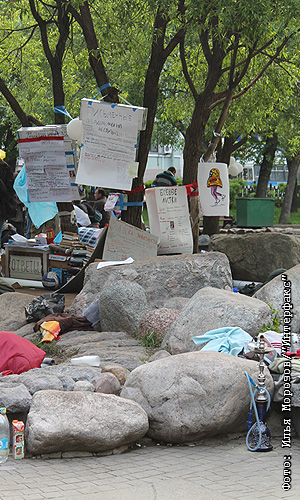 Утром в субботу в расположение лагеря пришла жительница одного из близлежащих домов и пожаловалась оппозиционерам на то, что они вытоптали газон. В ответ на это молодые люди пообещали посадить несколько клумб тюльпанов.