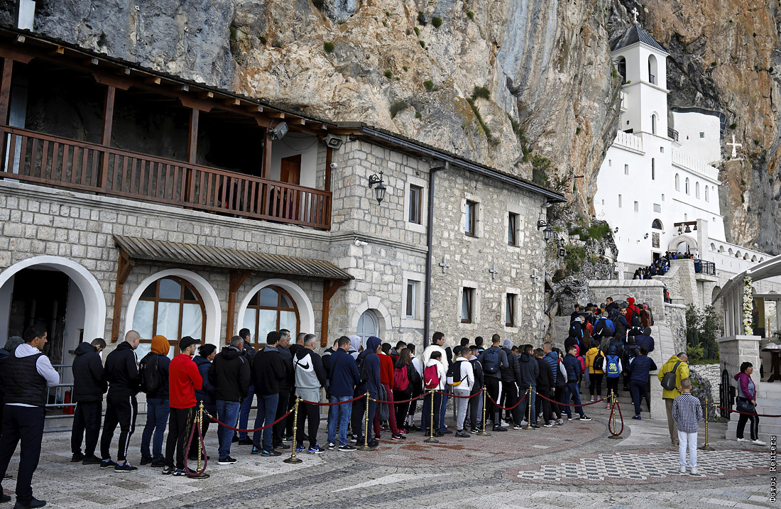 В Черногории верующие стоят в очереди, чтобы посетить гробницу Святого Василия во время паломничества в средневековый монастырь Острог в Никшиче