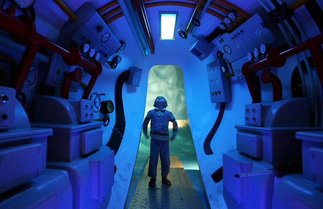 Мальчик изучает модель подводной лодки в Детском музее Шанхая, Китай
