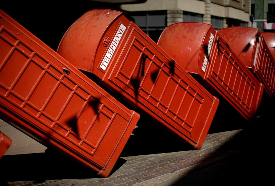 Инсталляция художника Дэвида Мэча из телефонных будок 1989 года в Кингстоне, Великобритания