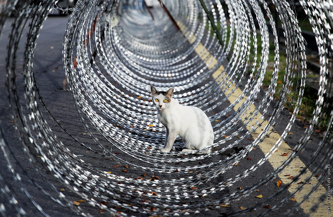 Кошка в ограждении из колючей проволоки в Петалинг-Джая, Малайзия