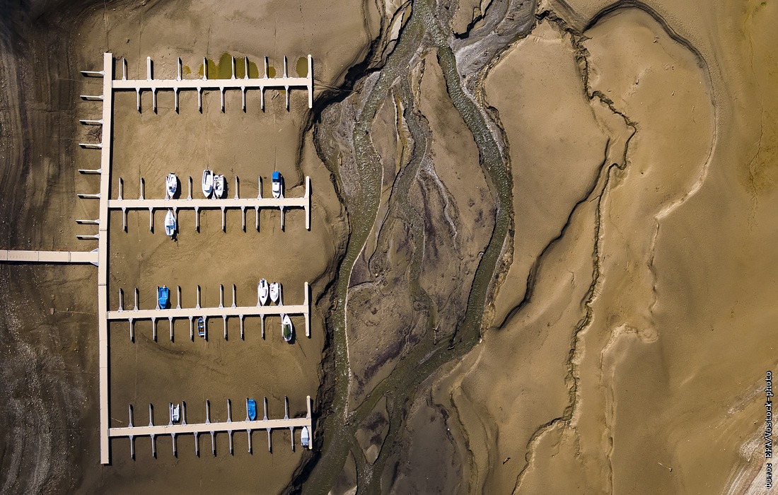 Лодки, застрявшие в высохшей бухте озера Грюйер, Швейцария