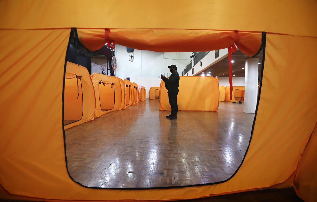 Индонезийские чиновники проинспектировали изоляционные палатки для людей с симптомами COVID-19 на стадионе Джакарты, который должен стать больницей скорой помощи