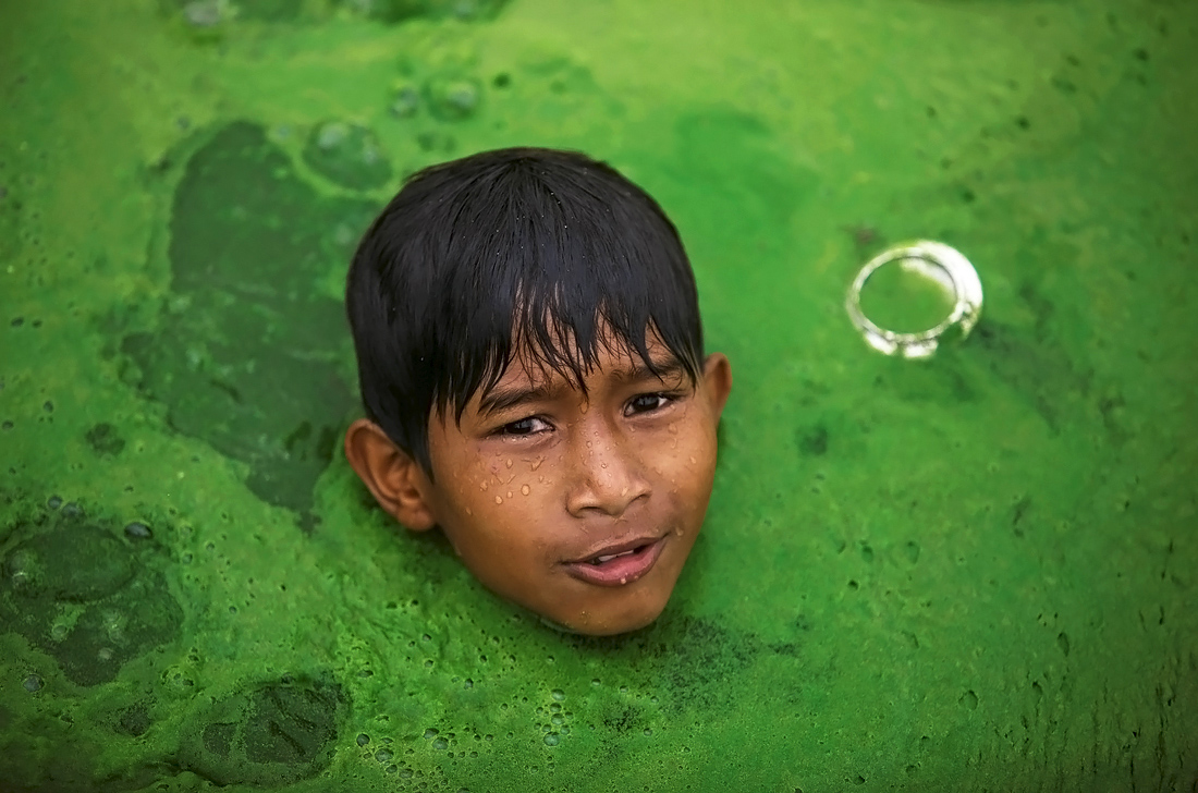 Непальский мальчик купается в озере, покрытом водорослями