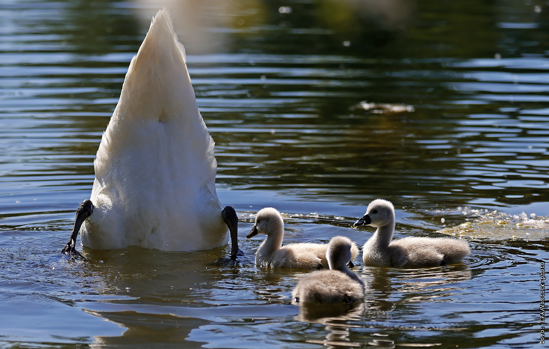 Лебедь-шипун с птенцами в пруду в Альтрипе, Германия