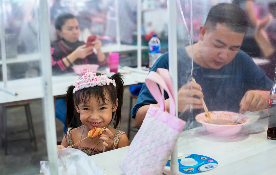 В фуд-кортах Бангкока устанавливают прозрачные пластиковые перегородки