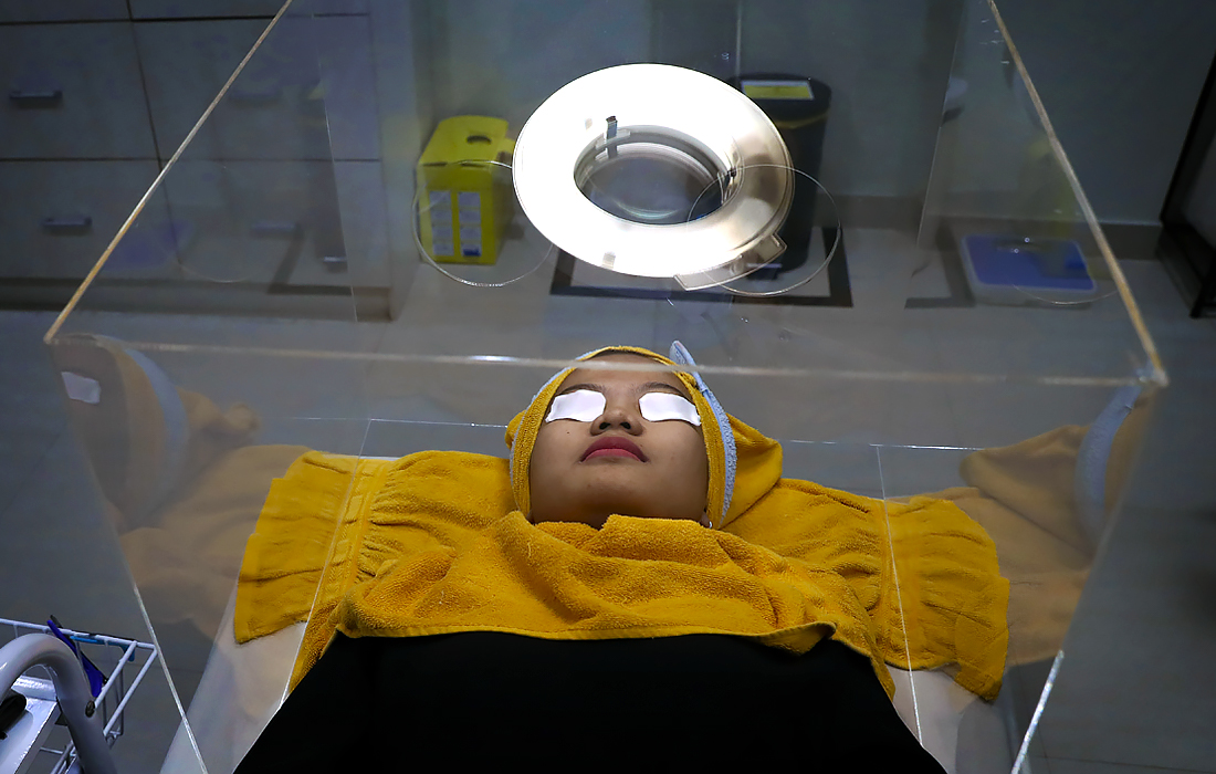 25 июня. Пациентка ожидает приема в клинике красоты в Джакарте в защитном боксе, используемом в качестве меры предосторожности.