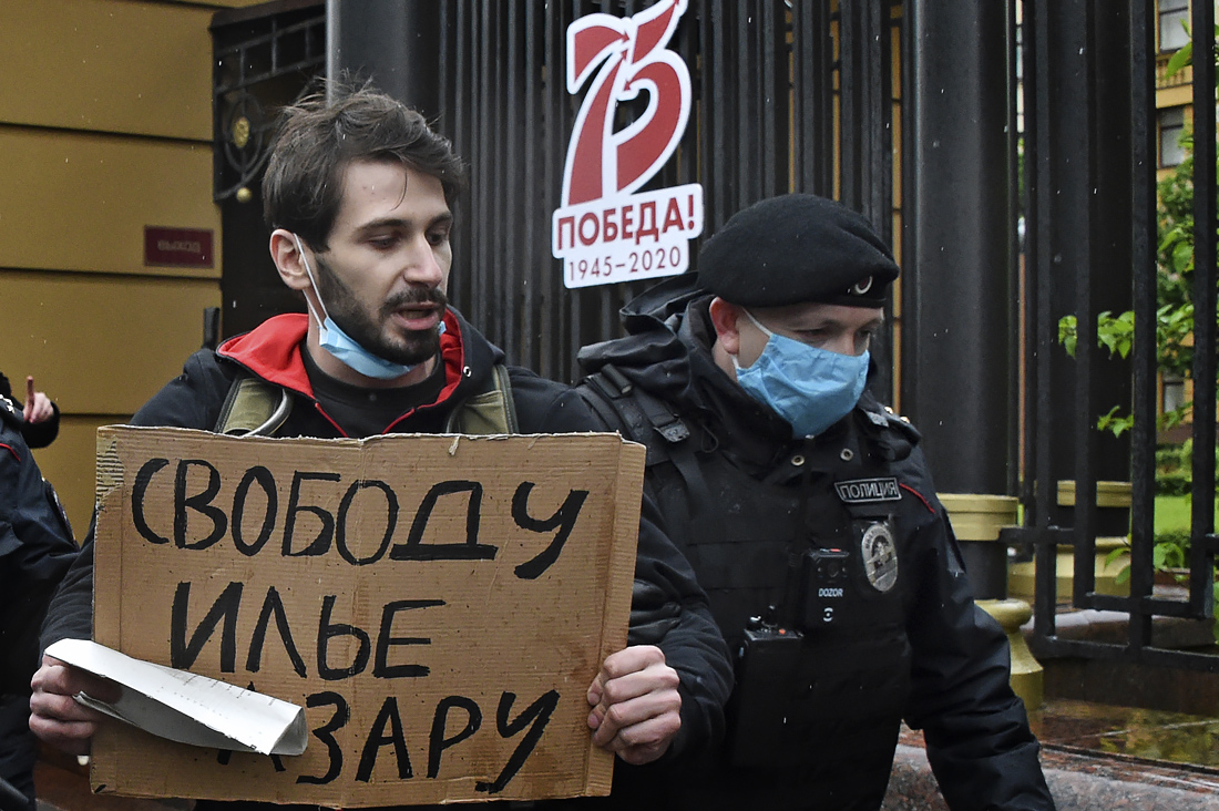 В Москве продолжаются одиночные пикеты в поддержку журналиста и муниципального депутата Ильи Азара. Он был задержан 26 мая также на Петровке 38. Азар встал там с пикетом в поддержку "Омбудсмена полиции" Владимира Воронцова.