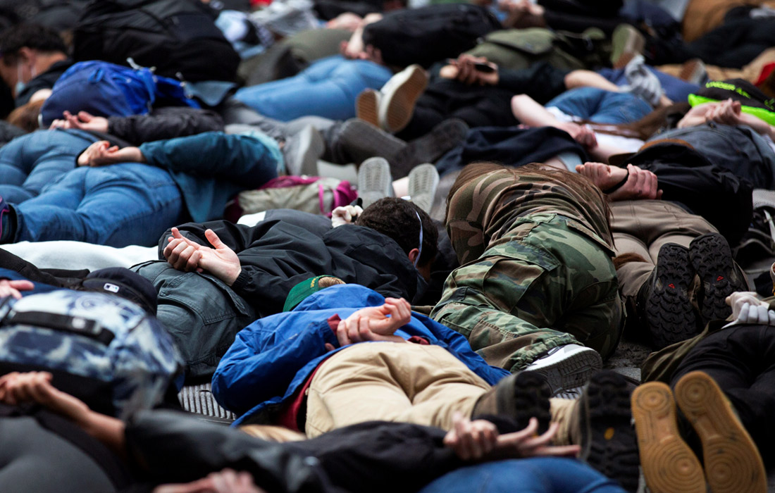 Протестующие в Сиэтле проводят минуту молчания в том положении, в котором находился Джордж Флойд во время смерти