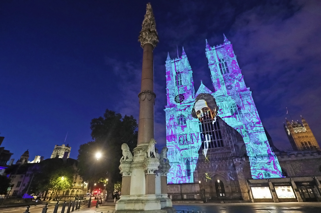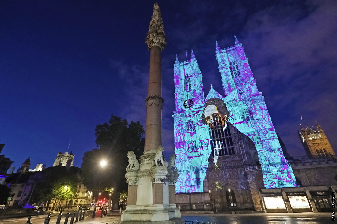 В честь 150-й годовщины со дня смерти Чарльза Диккенса его портрет спроецировали на Западные башни Вестминстерского аббатства в Лондоне