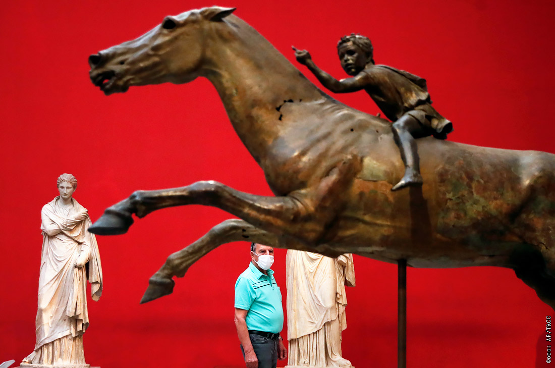 Греческие музеи открылись после трех месяцев карантина. Посетители должны соблюдать дистанцию и использовать защитную маску. На фото: Национальный археологический музей в Афинах.